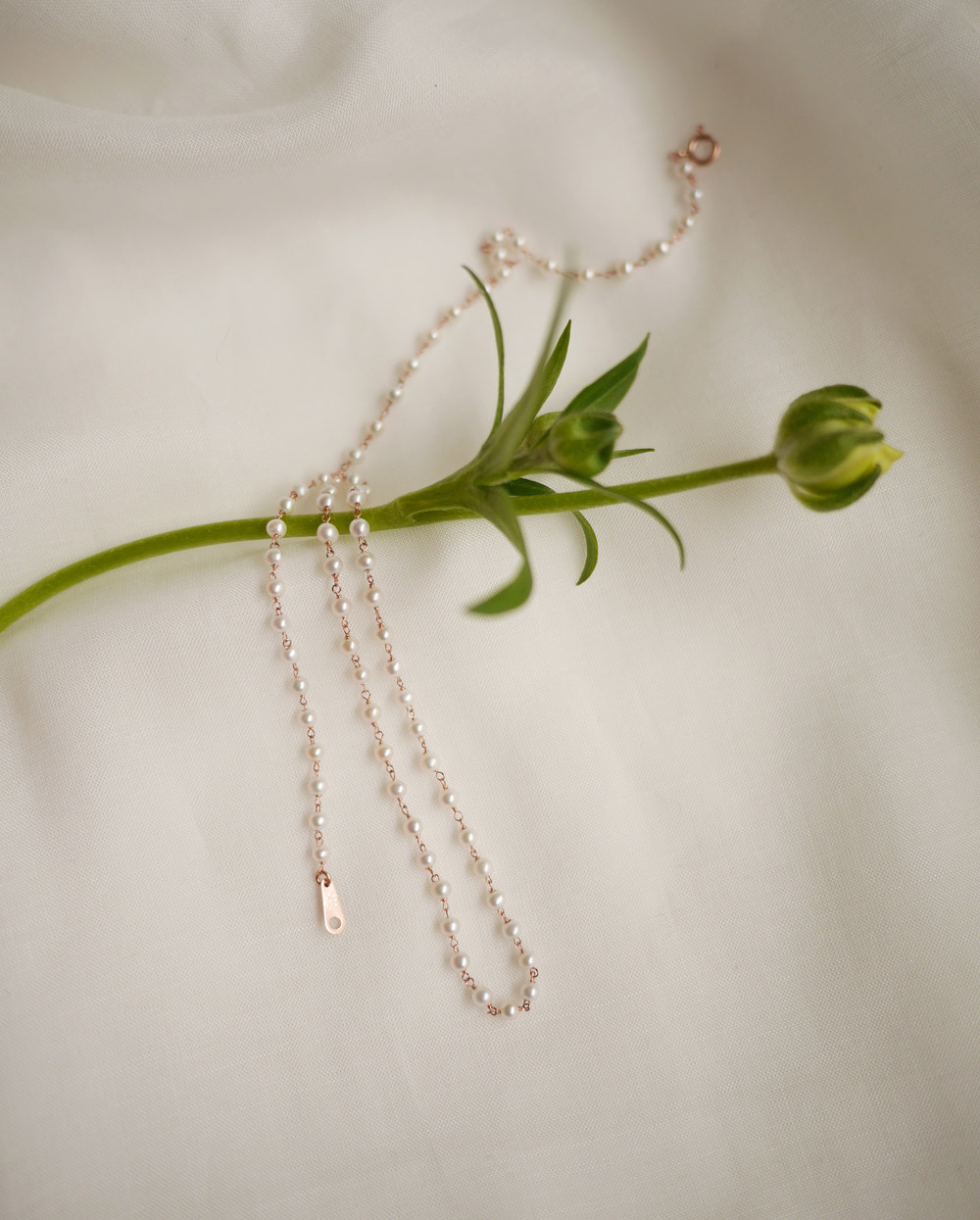 얇은 금 선으로 진주를 하나씩 엮어 제작되었으므로 강하게 당겨지는것을 꼭 피해주세요