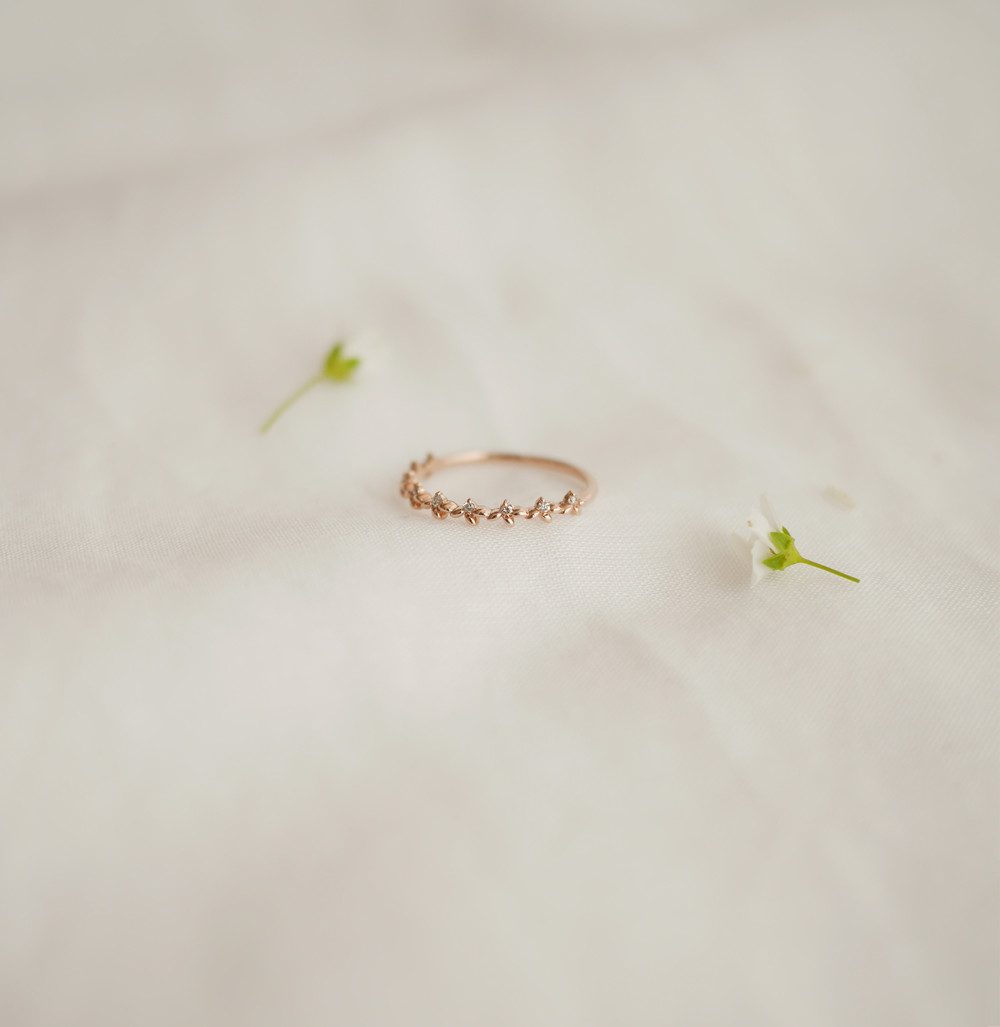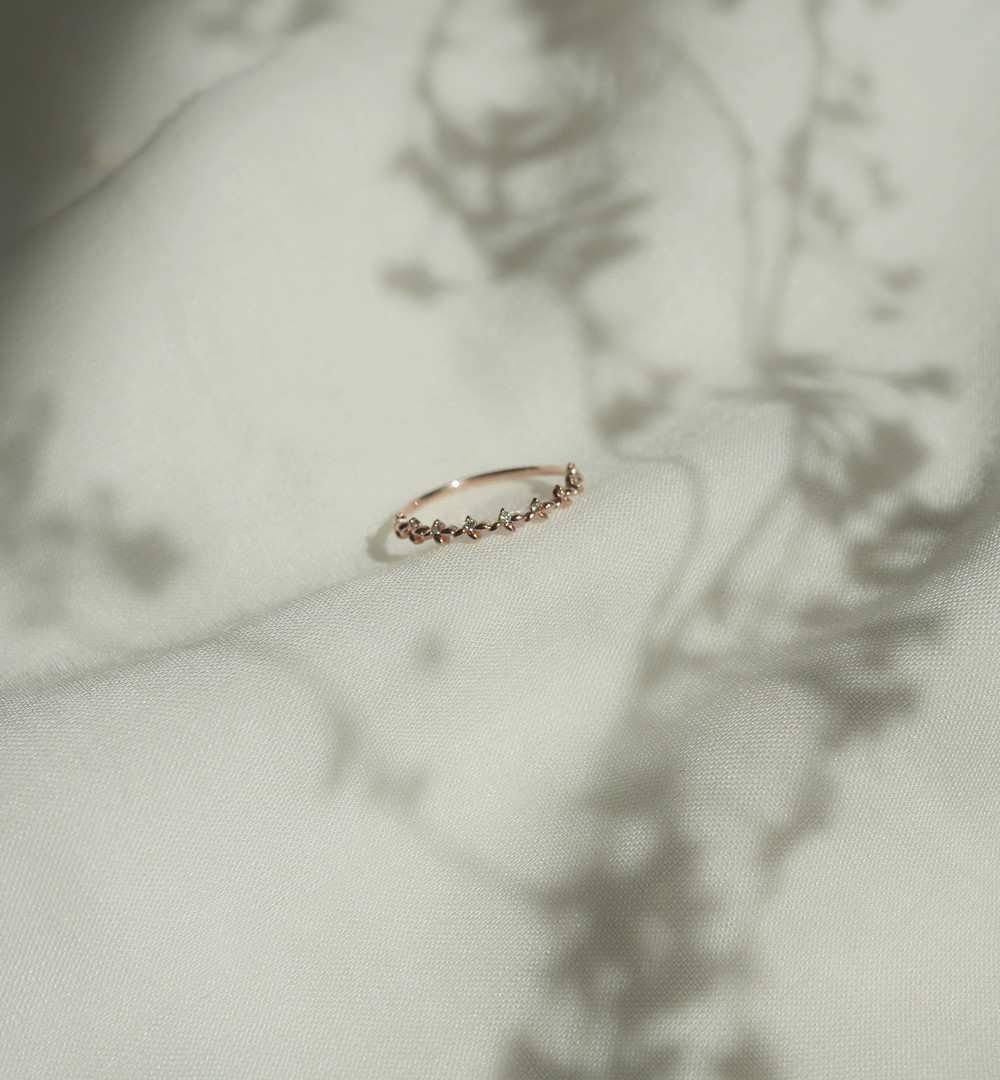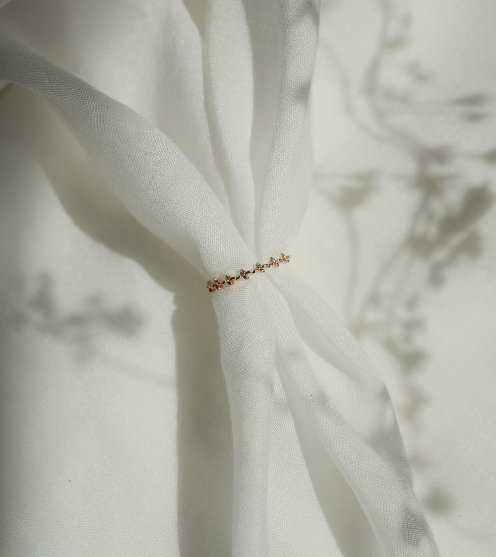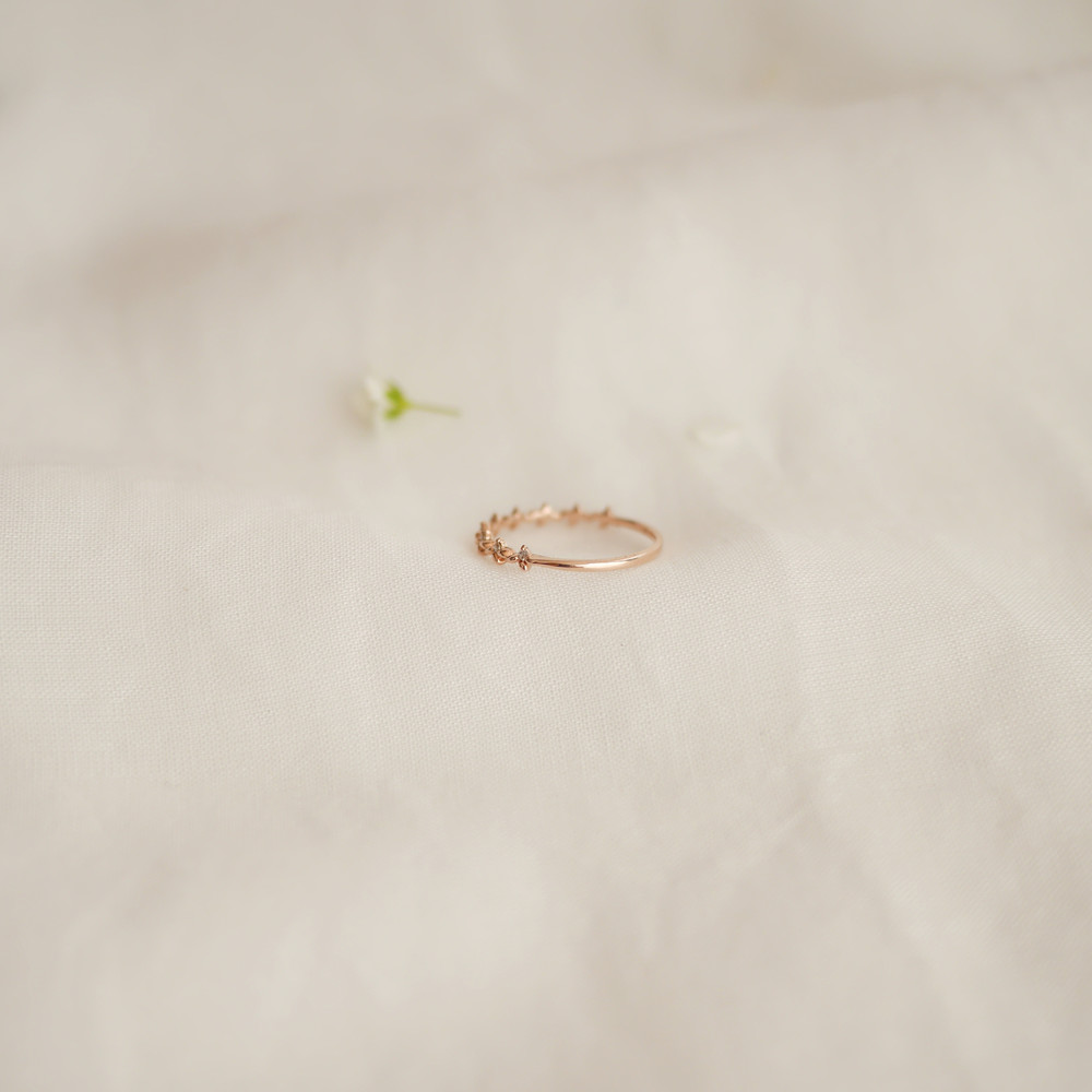 작은 나뭇잎 모티브와 샴페인 다이아몬드가 잔잔한 패턴으로 어우러진 반지입니다