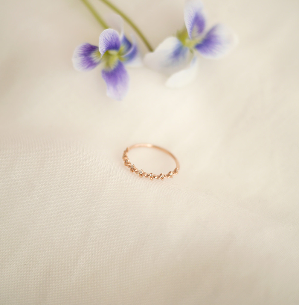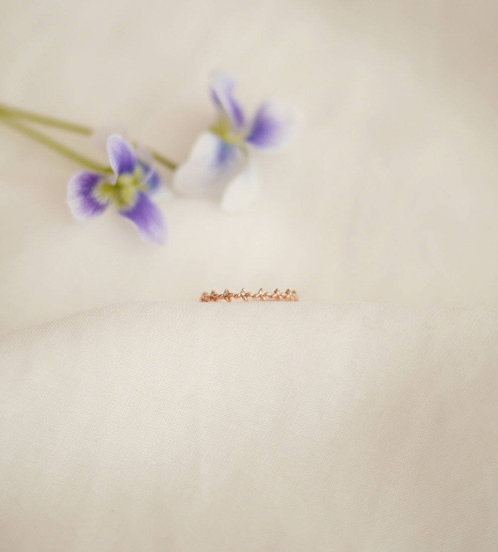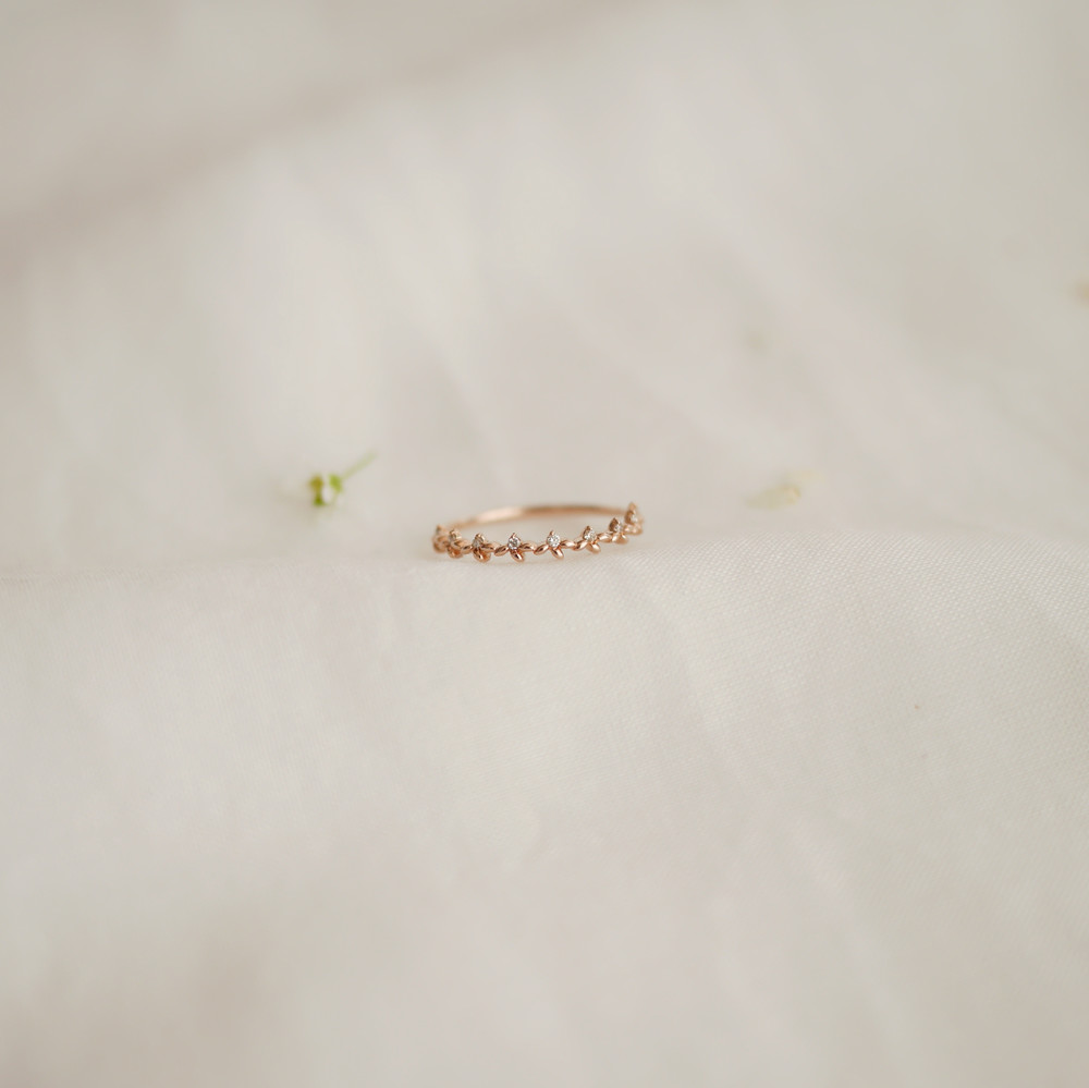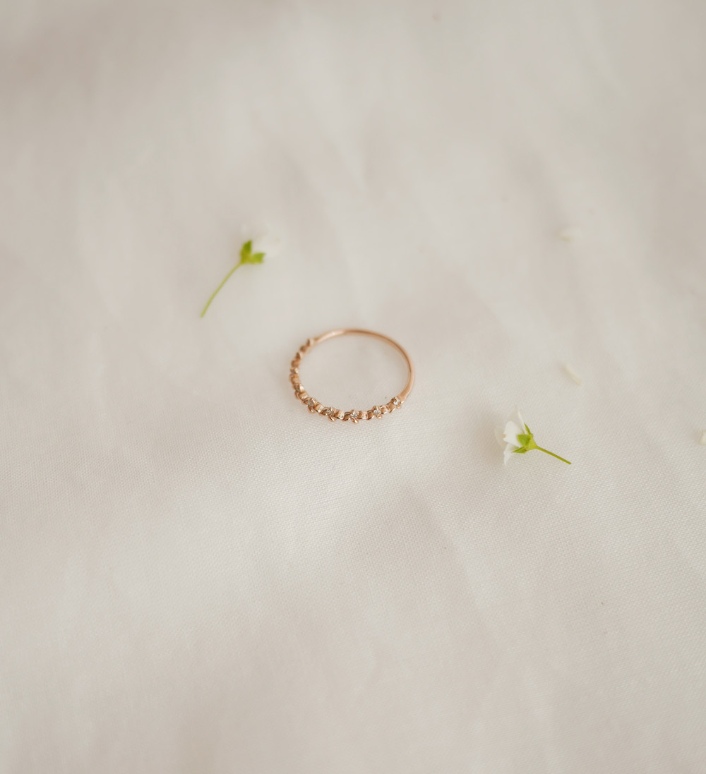 작은 나뭇잎 모티브와 샴페인 다이아몬드가 잔잔한 패턴으로 어우러진 반지입니다