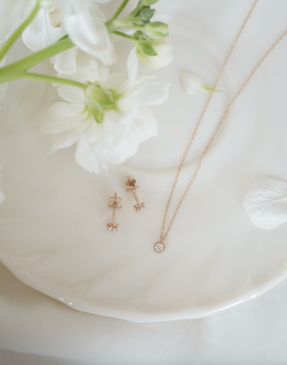 14k 로즈골드에 화이트 다이아몬드 세팅입니다