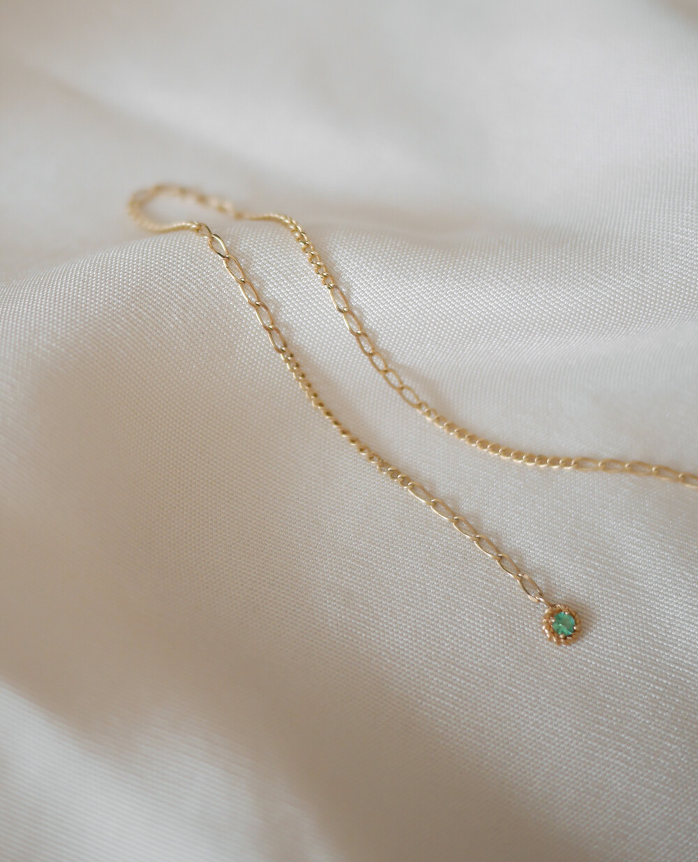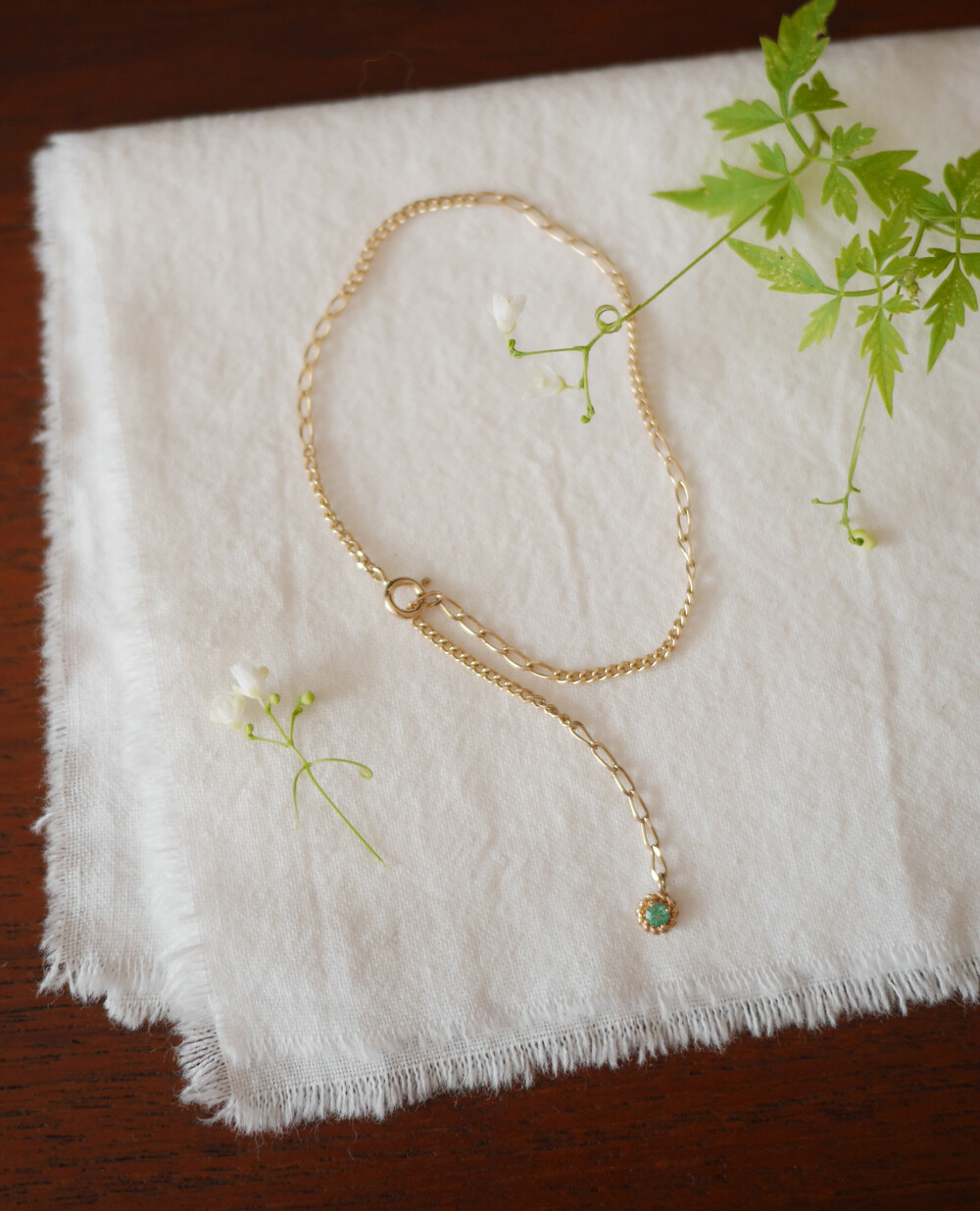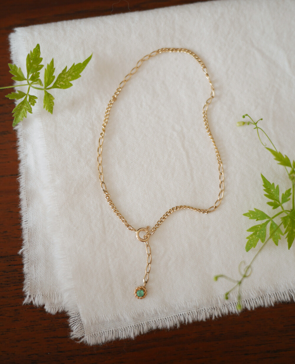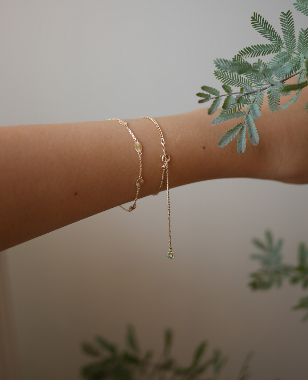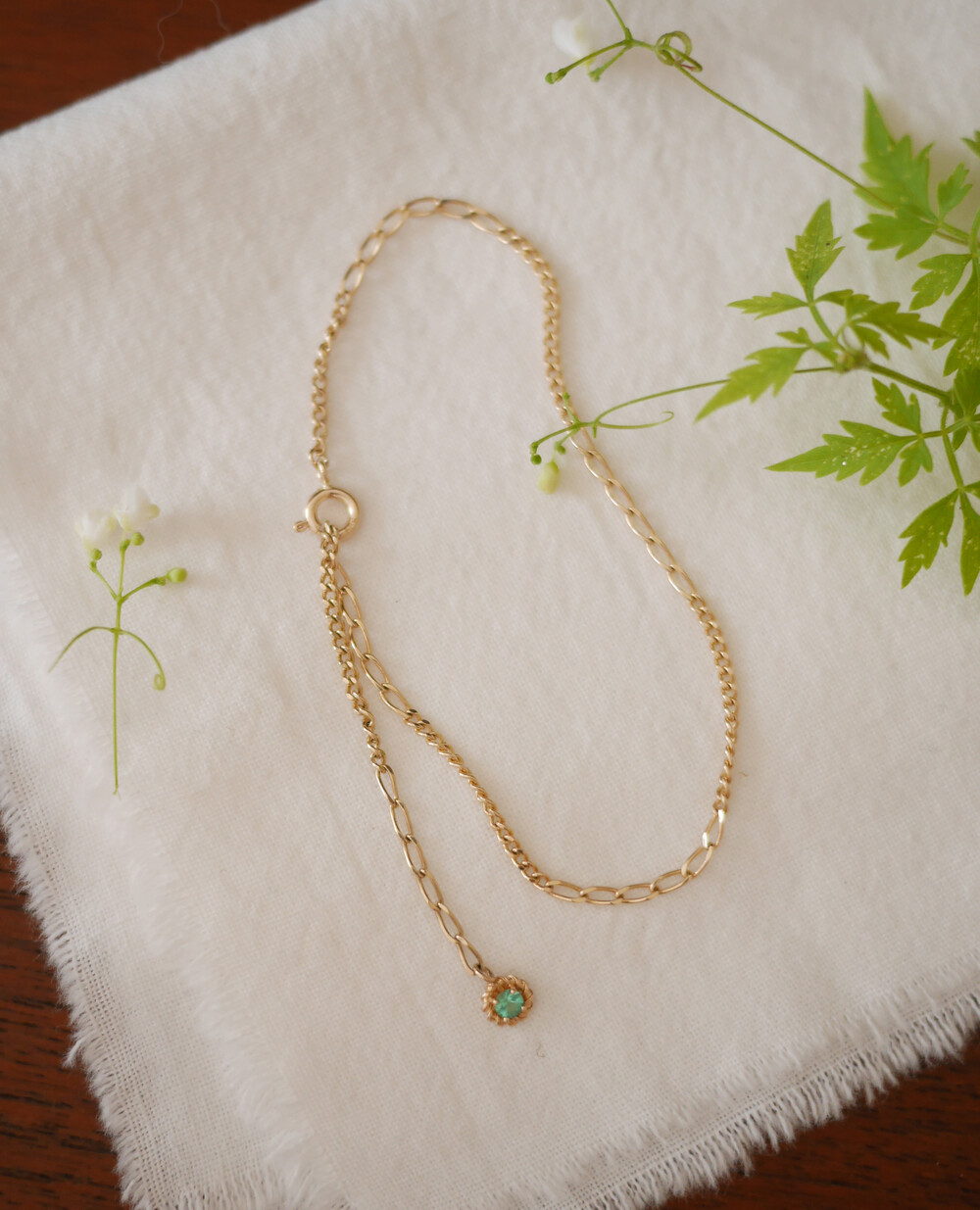 플랫한 체인 끝에 선명한 초록색의 에메랄드 참을 포인트로 준 팔찌입니다