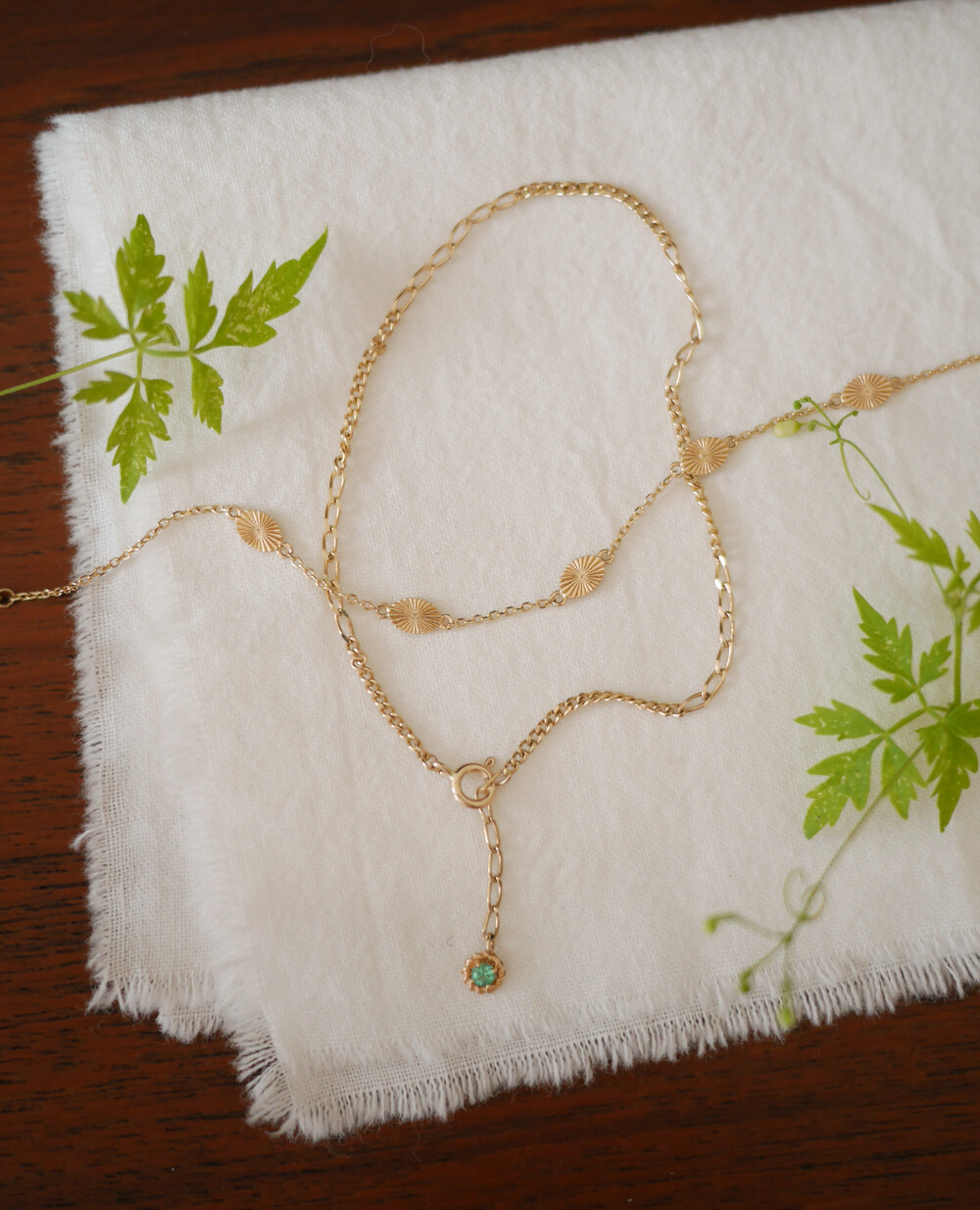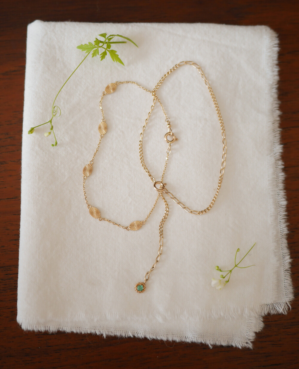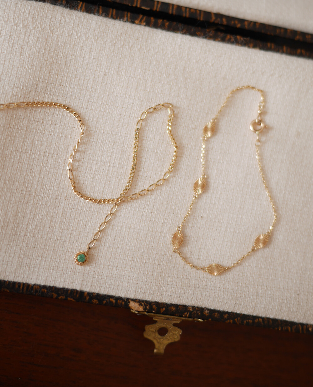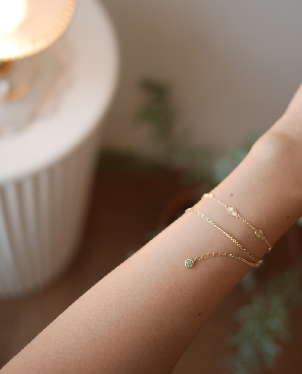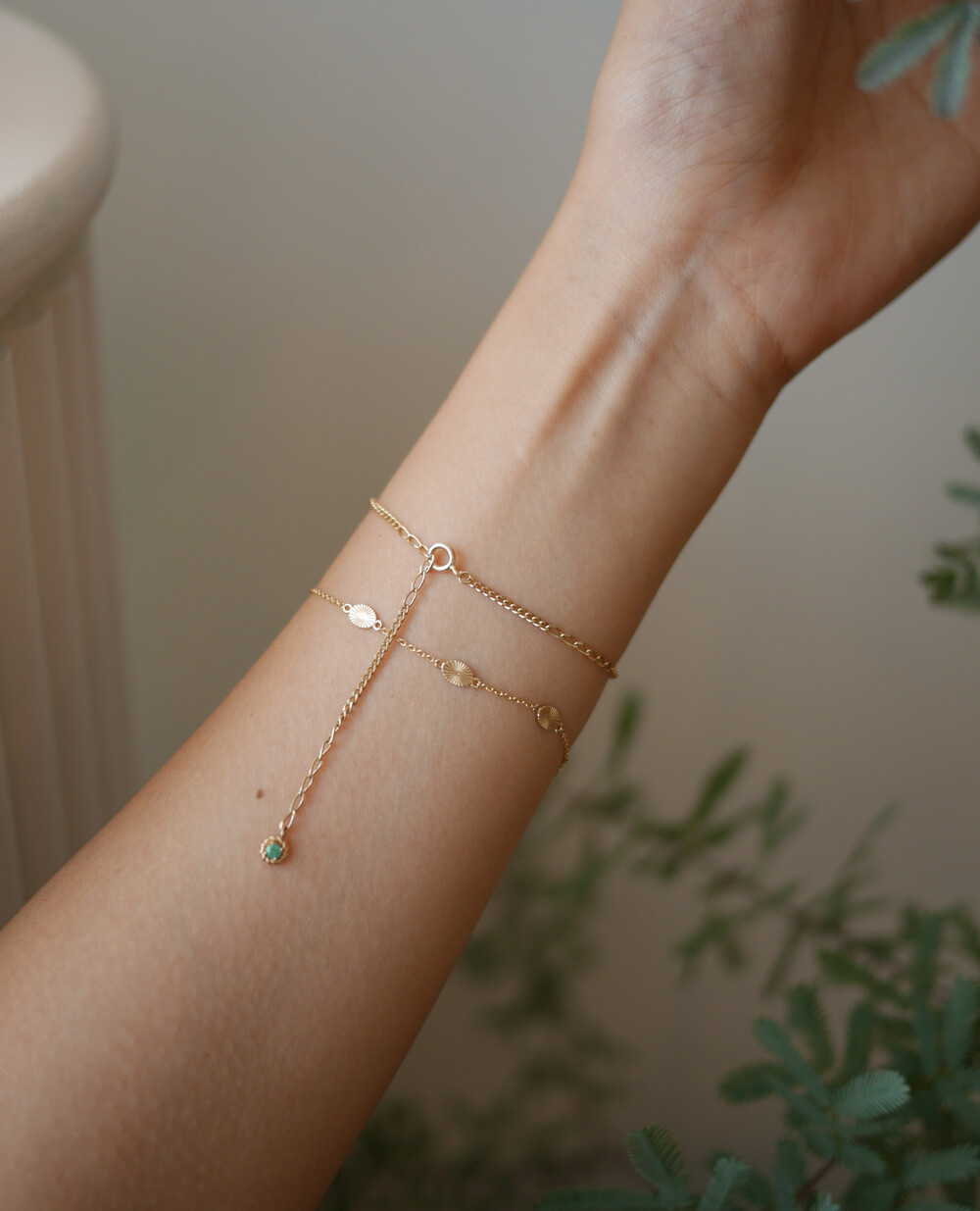 플랫한 체인 끝에 선명한 초록색의 에메랄드 참을 포인트로 준 팔찌입니다