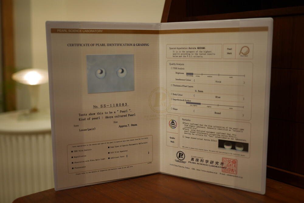 도쿄의 진주 과학 연구소에서 심층 감별 후 발행된 MADAMA 감별서입니다