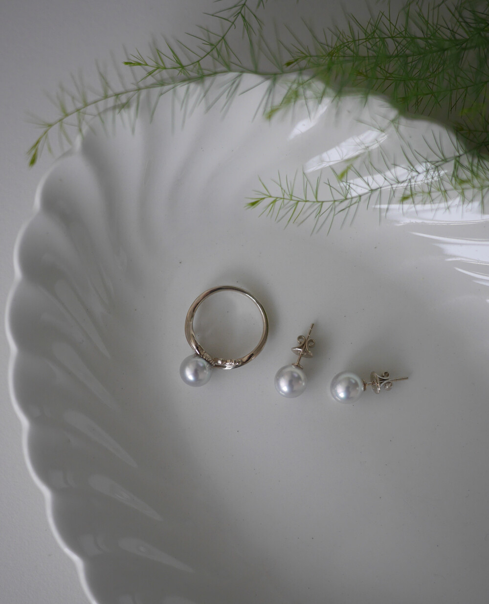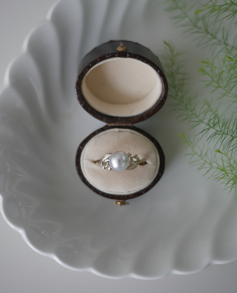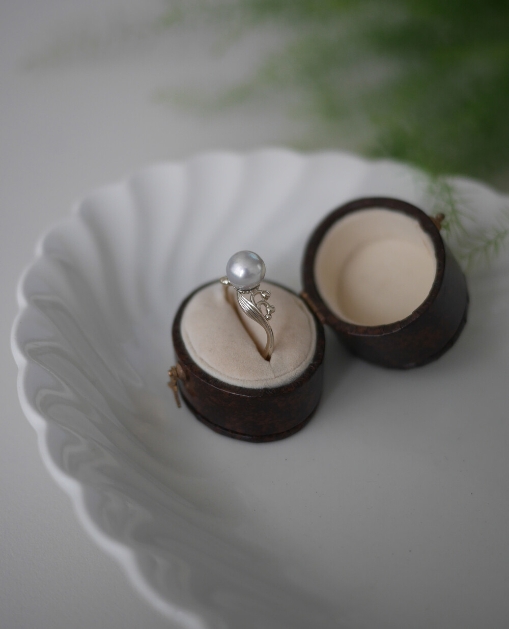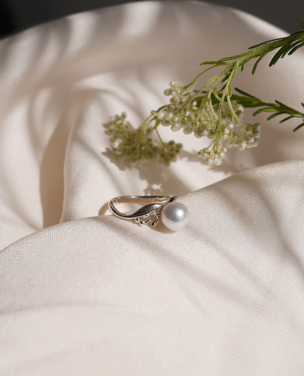 단아한 은방울꽃 모티브의 밴드와 진주 곡면의 조합이 아름다운 제품입니다