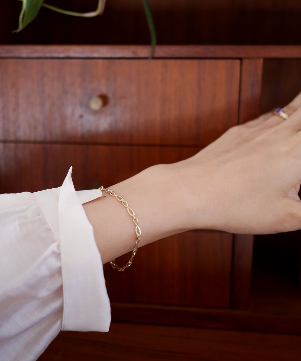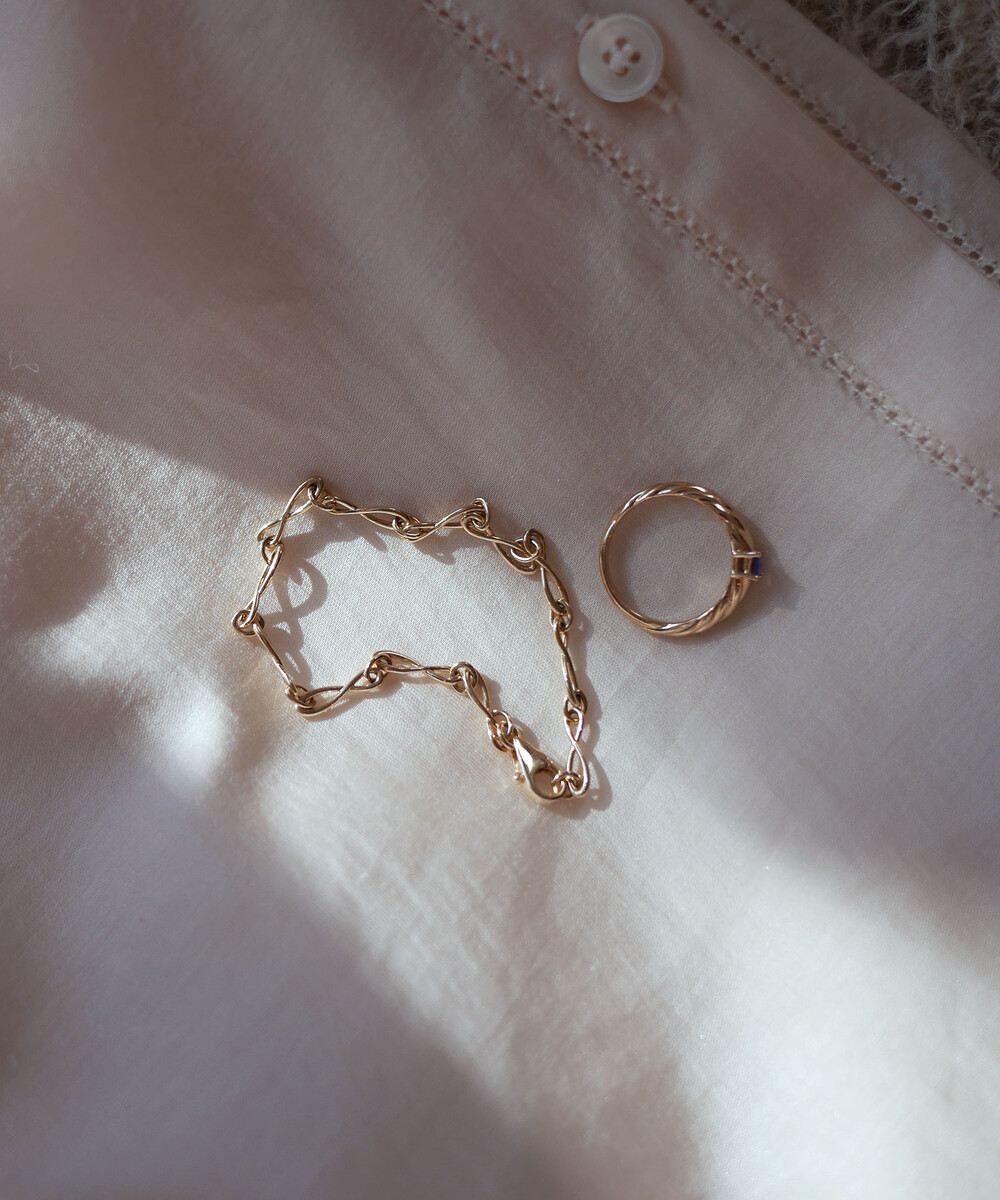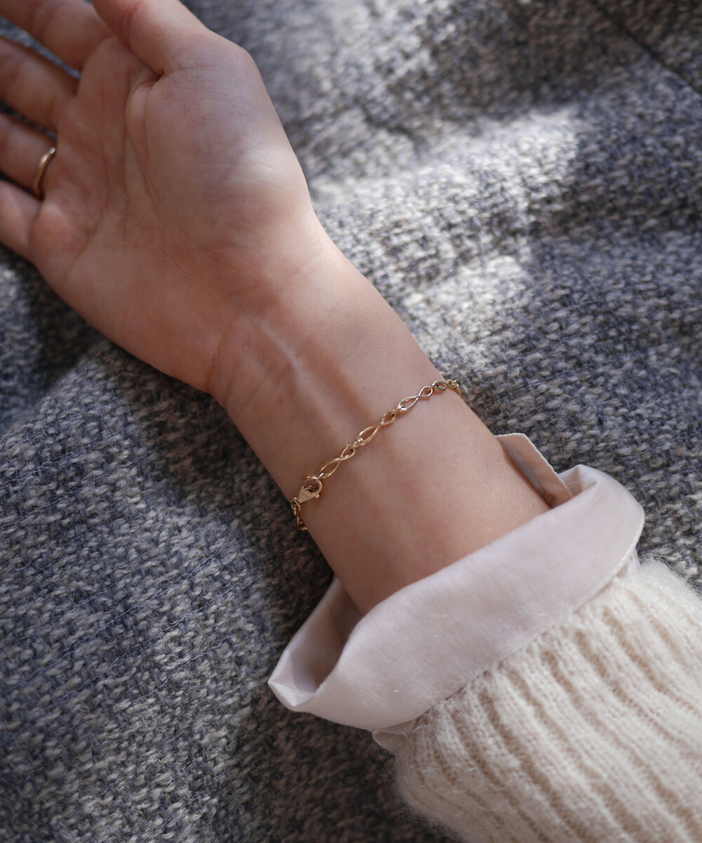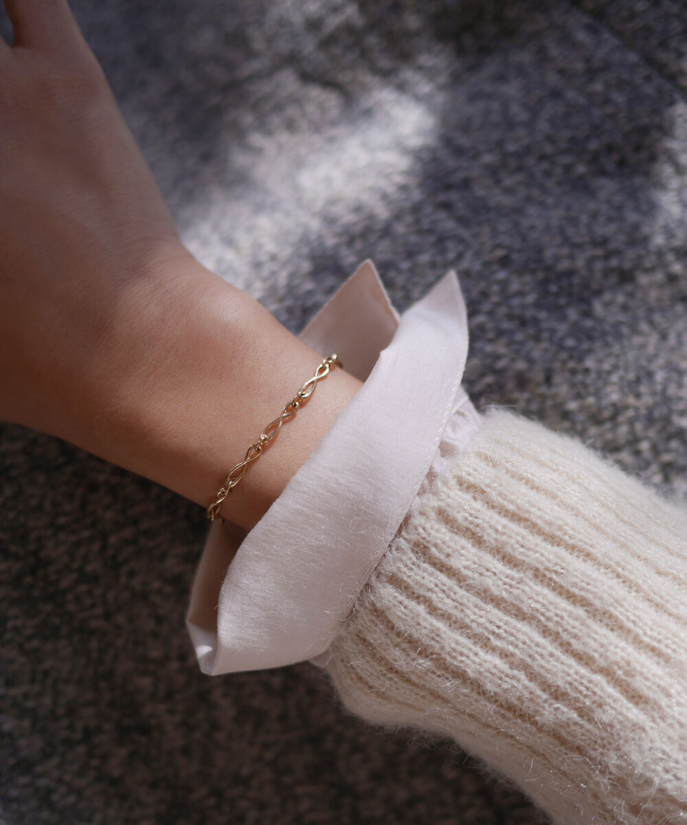 한마디의 길이가 긴 팔찌로 양 끝의 동그란 고리를 조절해 사이즈를 맞춥니다
