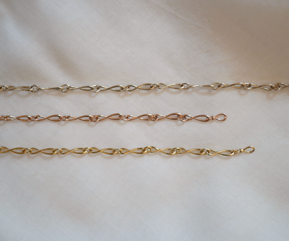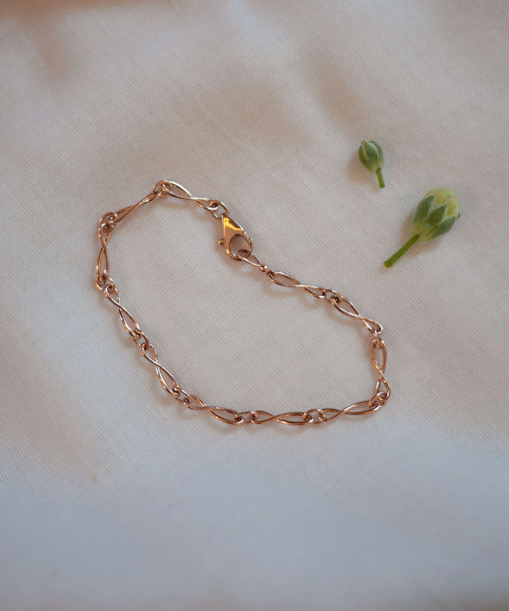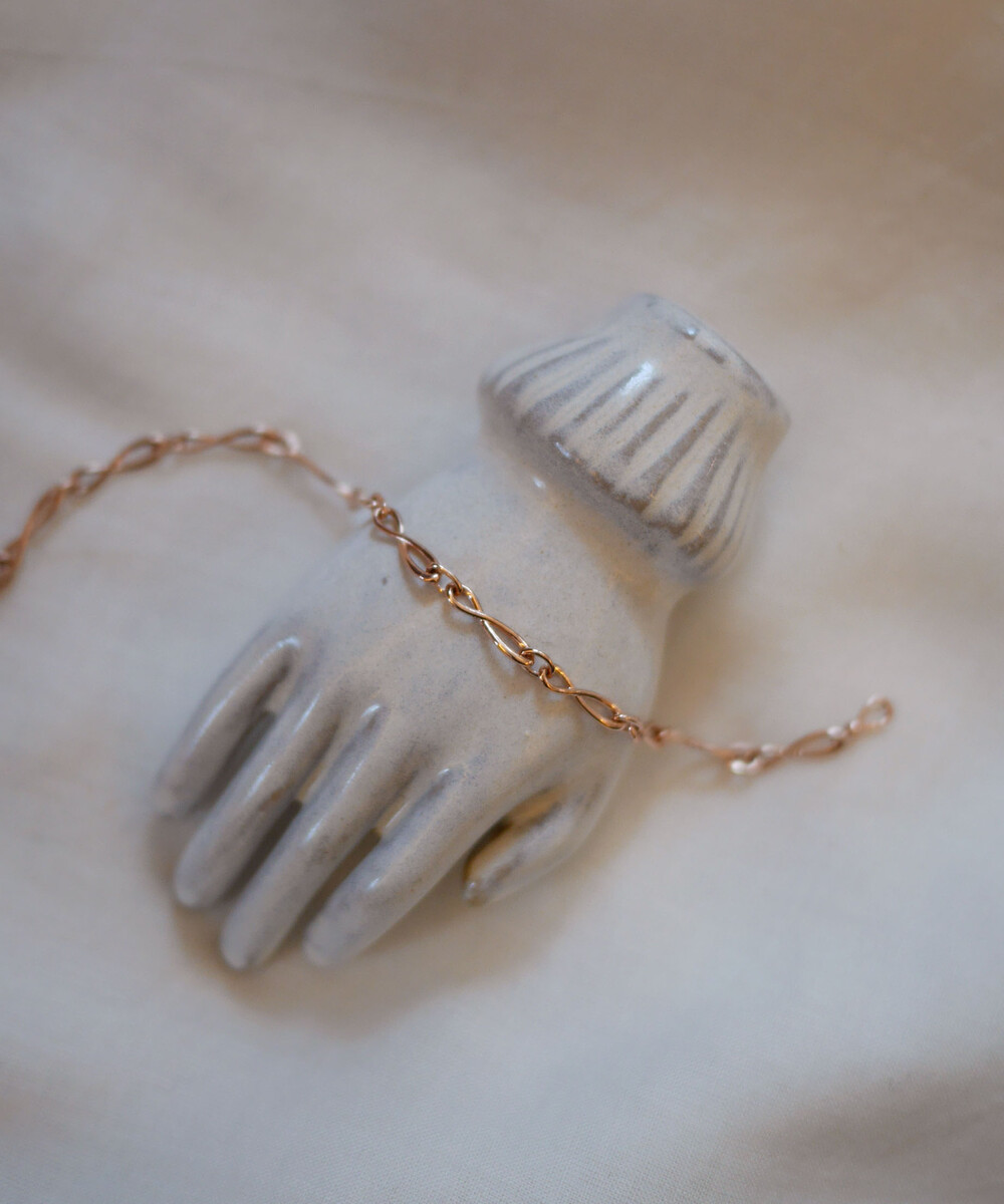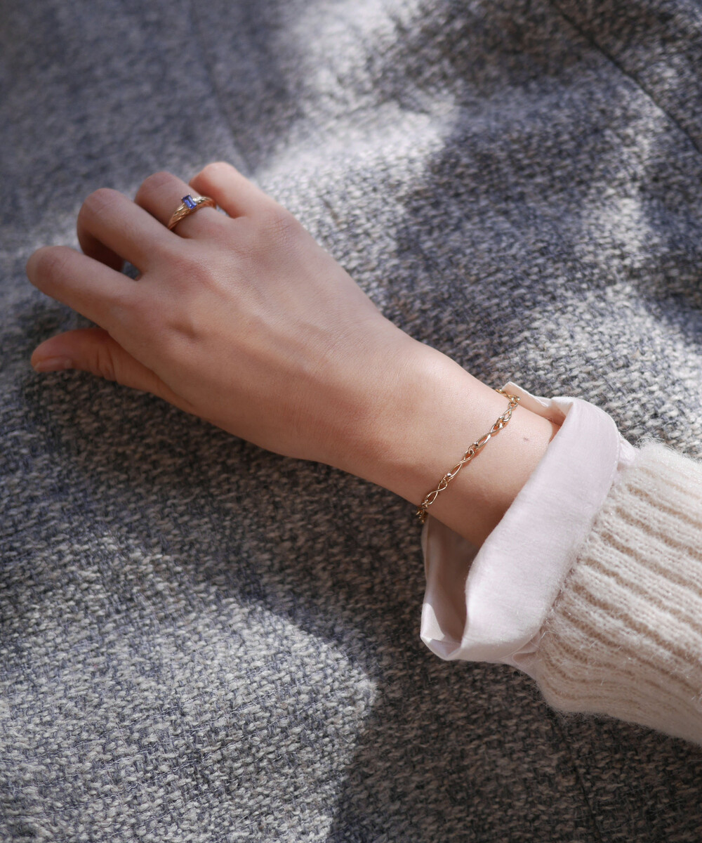 한마디의 길이가 긴 팔찌로 양 끝의 동그란 고리를 조절해 사이즈를 맞춥니다