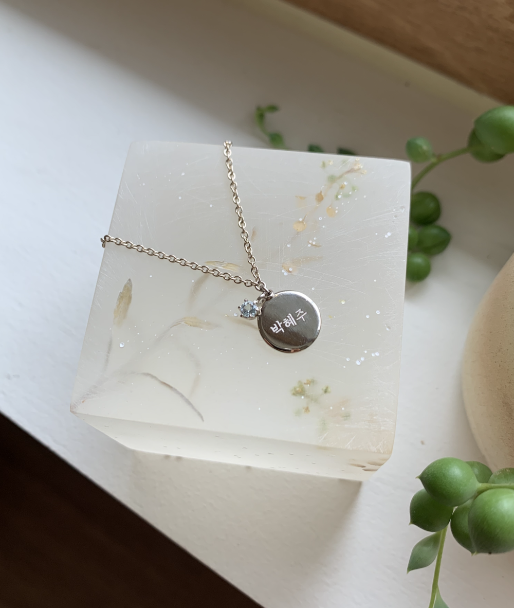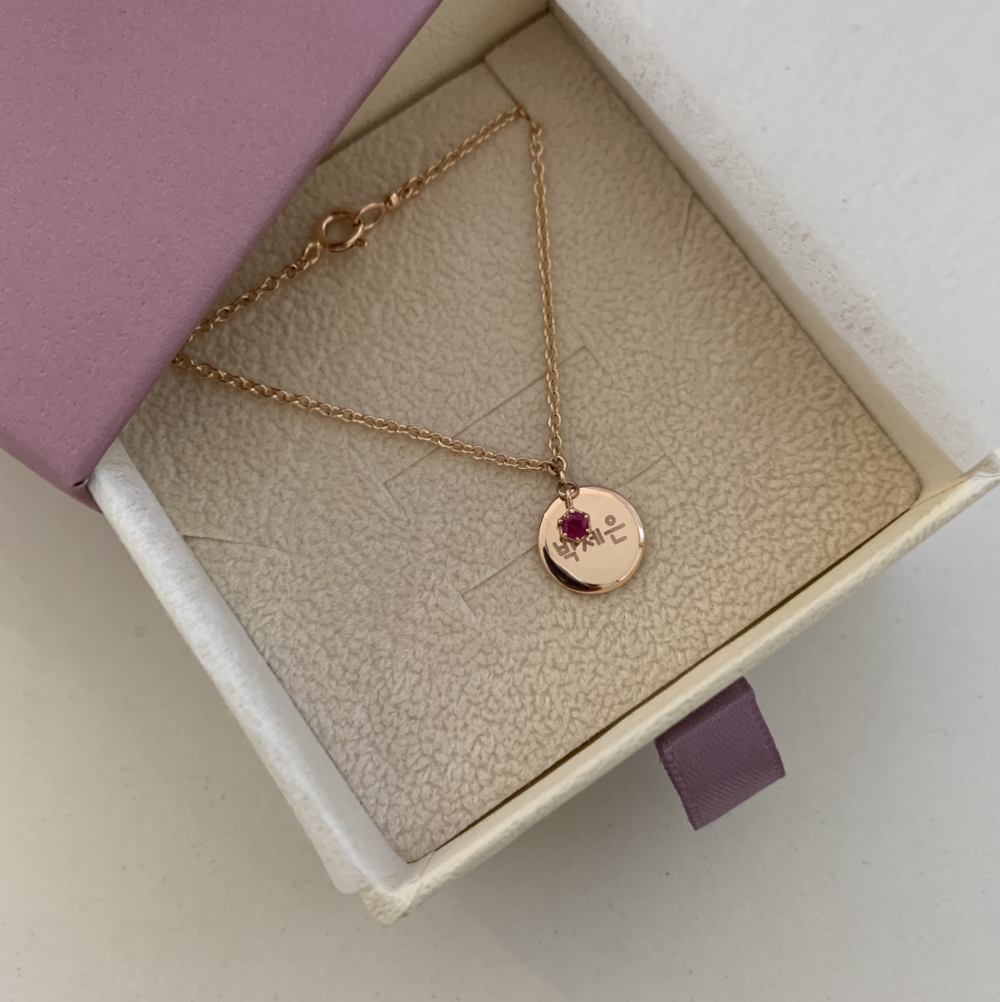 착용시에는 코인 위로 탄생석 참이 올라가 피부에 직접 닿지 않도록, 착용시 불편함을 최소화했습니다